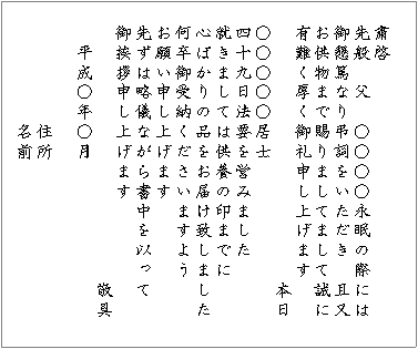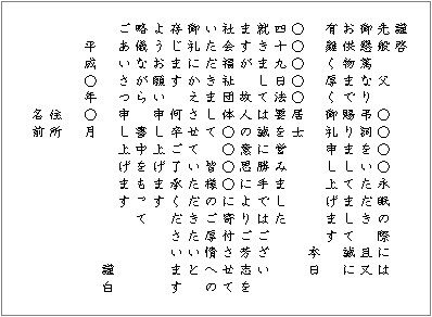 亡くなった方の意思で香典の一部または全額を、社会福祉団体などに 寄付したときは香典返しをしないときがあります。 その時は、忌明けの挨拶状に、その旨を記して理解していただきます。 【寄付をしたときの挨拶文例】